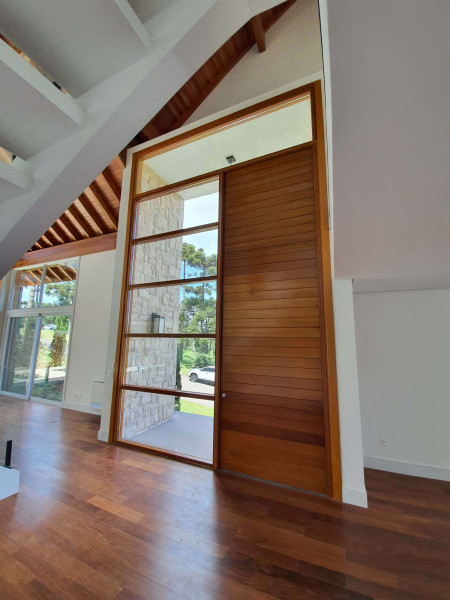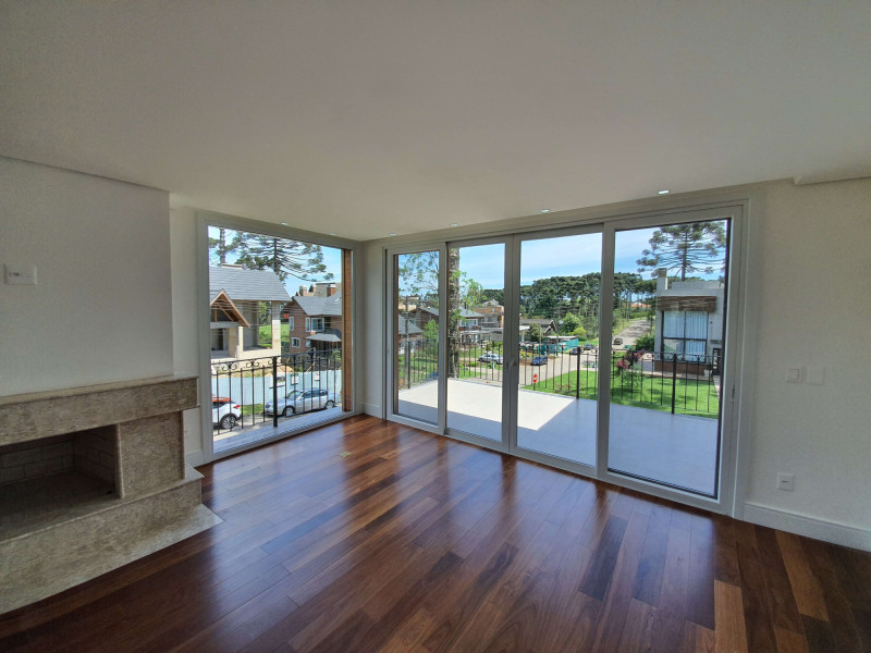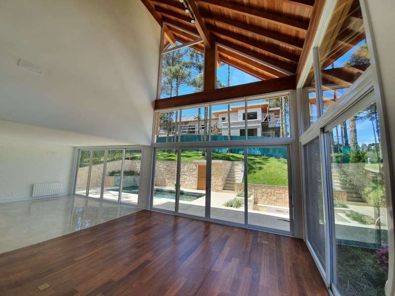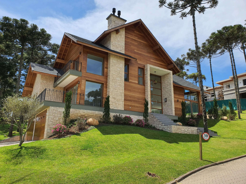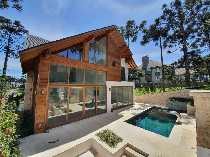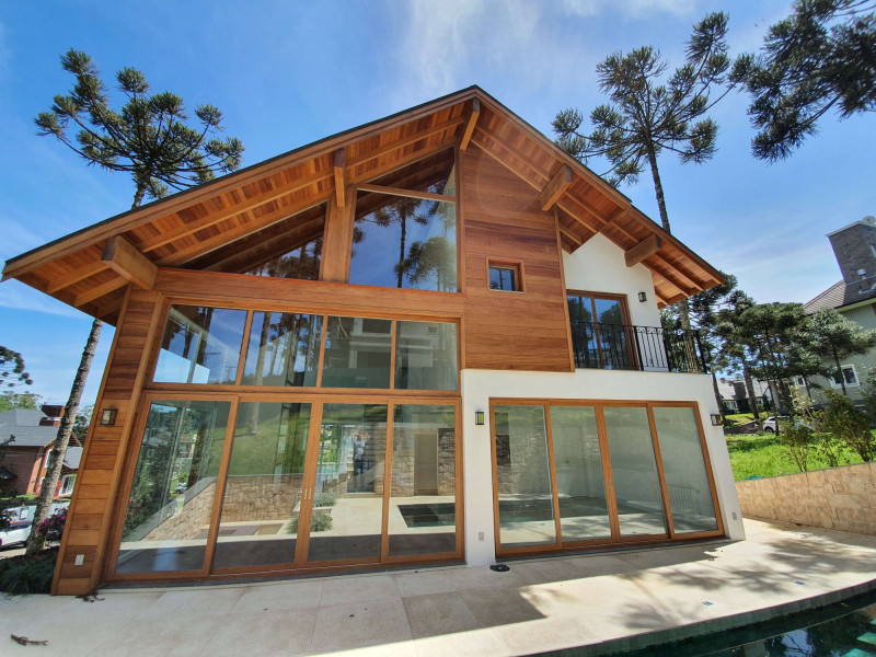 Esta Residência é composta por esquadrias com retrofit amadeirada na cor Carvalho. O projeto sustenta uma agradável sintonia com o ar da serra, completando em sua harmonia natural do seu ambiente. Portas internas brancas com pintura PU, também são propostas de leveza para o interior da obra.